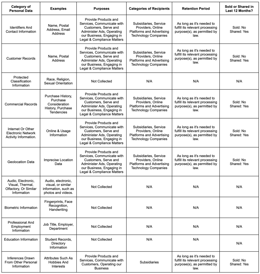 We collect, store, use, and disclose your personal data for various business and commercial purposes, as outlined in this Privacy Policy. These purposes are detailed in the sections "What Information Do We Collect?", “How Do We Use Information That We Collect?”, and "How Do We Disclose Information That We Collect?" (collectively referred to as "Purposes"). The sources of personal data collection are explained in the "What Information Do We Collect?" section. The table below categorizes the personal data we collect, along with: